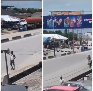 According to reports, a fully loaded tanker coming down from the flyover at high speed lost control and rammed into a tricycle (keke) and a Toyota Corolla.